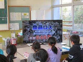 「食品ロス」をテーマに、元気っ子委員会が発表をしました。子どもたちは、世界には食べるものが少なくて苦しんでいる子どもたちがいっぱいいること、一方日本ではまだ食べられるのに捨ててしまっている食べ物、いわゆる「食品ロス」がたくさんあることについて知り、「食品ロス」を減らしていこうということを学びました。