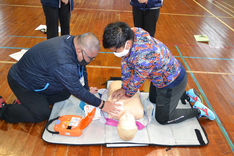 延岡市消防本部の方から胸骨圧迫法とAEDでの救急措置のしかたについて教えていただき、演習を行いました。毎年受けている講習ですが、万が一に備えての救命救急の処置を学ぶよい機会となりました。