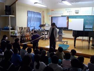 2校時に「ワークショップ」、3校時は宮沢賢治作「どんぐりと山猫」の劇を鑑賞しました。劇の途中で児童生徒が参加する場面もあり、大いに盛り上がりました。
