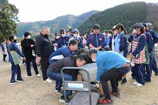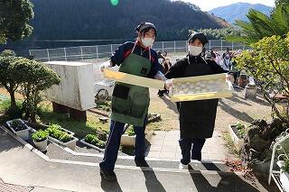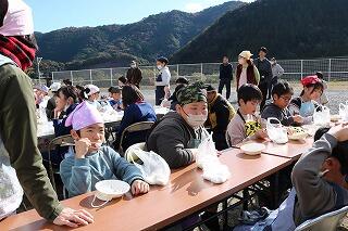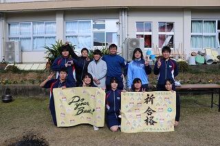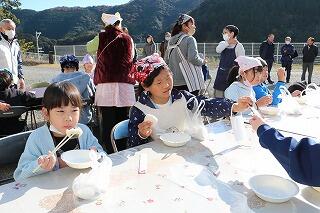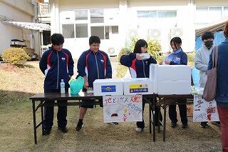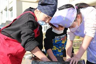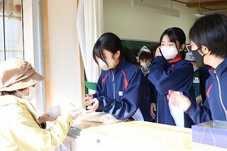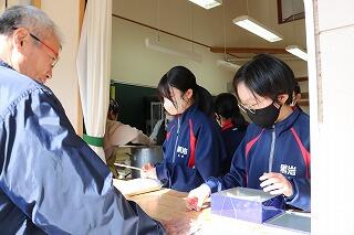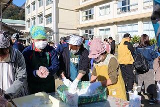 12月15日(日)は、天候にも恵まれ予定通り(手際が良く計画より少し早く終わりましたが)自分達の刈り取ったもち米を使って、地域の方々にも協力を得ながら餅つき→餅丸め→袋詰め→試食を行いました。地域の方にお礼の言葉と袋詰めした餅をプレゼントしました。また中学3年生に受験を頑張るようにエールを送りました。午後はPTAバザーが行われ、お手伝いや飲食を楽しんでいました。
