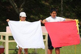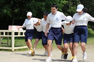 5月22日(日)に実施する黒岩小中学校体育祭の結団式です。まず、小学部と中学部が混ざったA・B班の代表による、3人4脚で勝ったチームから赤白のくじを引きます。赤団・白団が決定したら、各団毎に結団式です。