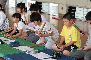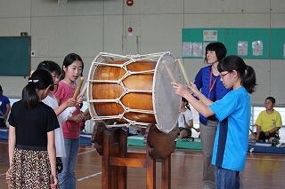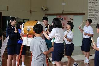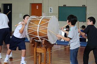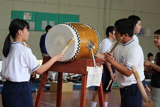体育祭に向けて、ばんば太鼓の練習を小学部と中学部が合同で実施しました。マットでたたく練習をしたり、交代で本物の太鼓を曲に合わせてたたいたりして練習しました。
