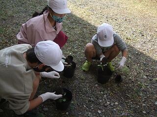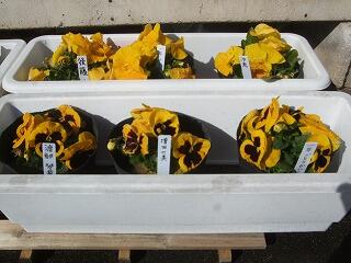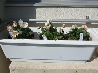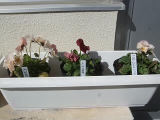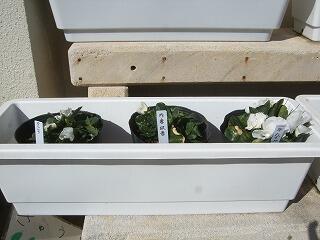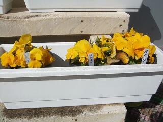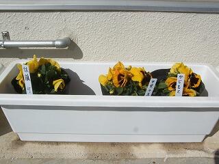 小学部は、一人一鉢として、パンジーの苗を大きな黒ポットに植えました。そのポットは、1つのプランターに3つずつ入れました。つまり、1つのプランターに3人分を入れました。