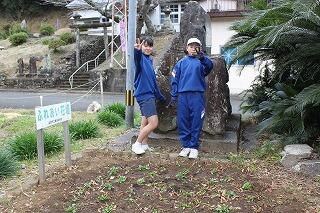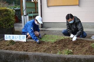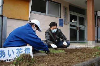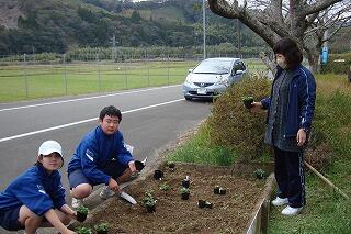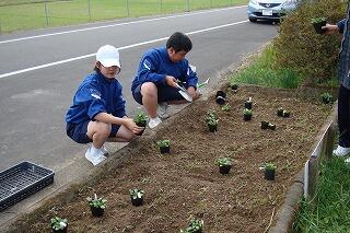 中学部は、各地区にある「ふれあい花壇」に行って、苗植えをしました。例年は、地区の方と一緒に活動していたようですが、今年はコロナ禍の影響で生徒のみの活動になりました。春には、各地区の花壇にきれいな花が咲くことでしょう。なお、校内のふれあい花壇にも苗を植えました。