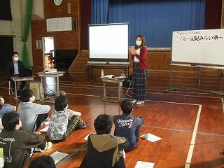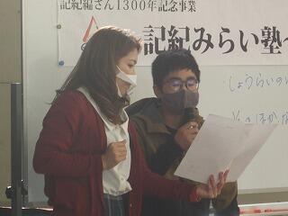 この会では、神話に関するDVD視聴のほかに、アナウンサー「柳田みより」さんの神話の読み聞かせがありました。また、柳田さんによる発声の仕方の練習などもありました。