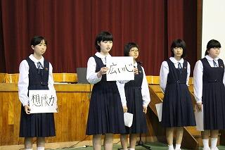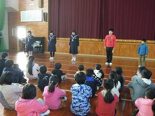 栄養教諭の先生・調理員さん・パンをつくっていただく方、牛乳をもって来ていただく方、給食を小学校から配送していただく方等への感謝の気持ちを発表する会を開きました。初めに、栄養教諭の先生から給食をつくるときの工夫・苦労等について話していただいました。その後、中学部の生活委員会、小学部の元気っ子委員会が給食に関係する話を劇にするなどして発表しました。