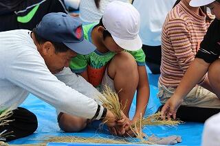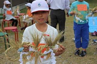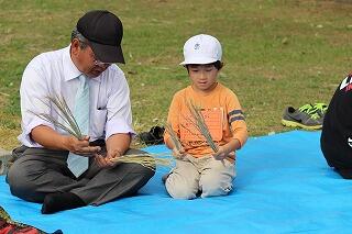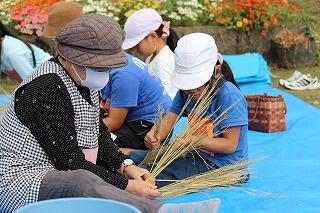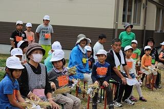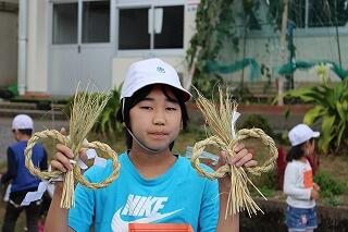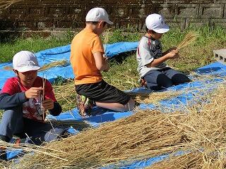 今回の土曜授業は、地域の方々とのふれあい授業です。内容は、将来の夢の発表やしめなわづくりです。このしめなわの材料は、学校で作った餅米のわらです。