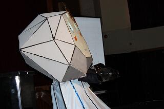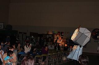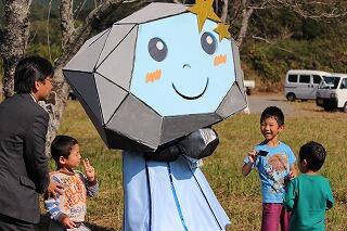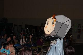 スポットライトを受けて、黒岩小中学校のイメージキャラクター「くろいわホーリィ」が登場です。保護者の方々・地域の方々にもかわいがってもらいたいです。