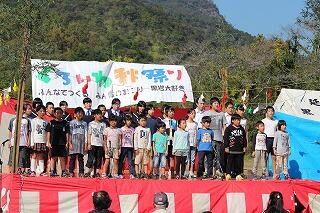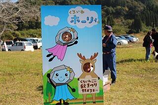 ▼秋祭りの看板には、黒岩小中のマスコットも登場です