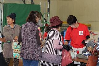 体育館の物品販売会場には、11時開始前から大勢の人が行列をつくりました。