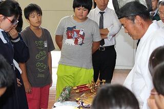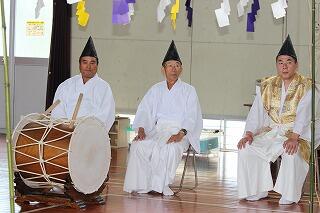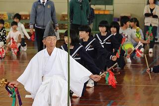 総合的な学習の時間(黒岩ふるさと学習)で、大野神楽につて学びました。地域の3名の講師から熱心に指導をしていただきました。明治15年に作られたお面や神楽で使用する道具などの説明を最初に受け、その後は全員で大野神楽を体験し、実際に神楽舞の実演を見ました。