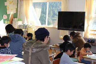 学校参観日でした。保護者の方々も子どもたちのそばについて一緒に考えていました。