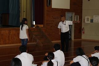 不審者対応の避難訓練を行いました。どんな犯人がどこから侵入してくるのか、あらゆる想定を考えて望みました。本番では、想定以外の場所からの侵入でしたが、児童生徒をどのように守るのかなど、職員にとっても子どもたちにとっても大変勉強になる時間でした。講師の先生からは、「いかのおすし」(いかない、のらない、おおごえでさけぶ、すぐににげる、しらせる)については、大人でも通用すること。大声を出すことについては、日頃から訓練する必要があること。車からの声かけについては、窓枠に触れないこと。気になる人との距離の取り方等についてのお話がありました。