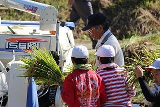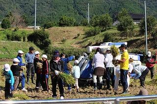●地域の方々の指導で小学生が鎌で稲を刈っています。
