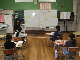 5年生の授業では、児童が生き生きと英語をしゃべって活動していました。分からないことは進んで聞いたり、間違いを恐れずに声を出して会話したりする姿は、まさに「主体的で、対話的な学習」ができていました。