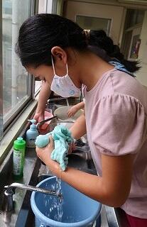 5・6年生が家庭科の授業で洗濯の学習をしました。もちろん、手洗いの洗濯です。洗濯機という便利な機械があるにもかかわらず、やはり基本となる手洗いを学習します。このことで、布に応じた洗い方や洗剤の使い方はもちろん、洗濯と環境に関わる問題などにも目を向けることにもなるようです。