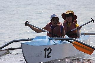 カヌー体験です。2人1組でカヌーをこぎます。2人の協力がないと思うように進みません。