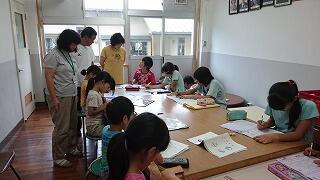 小学部は毎年、7月23日から地域の方々に協力していただいて、寺子屋教室を開いています。 朝9時から学習をしています。