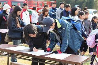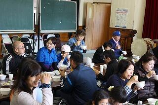 ぞくぞく到着して、完歩賞をもらっています。その後がお楽しみの「豚汁」「ぜんざい」です。とてもおいしく何杯もおかわりしている人もいました。地域と子どもたちの交流が図られたよい歩こう会でした。