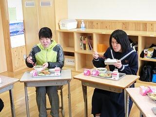 中学3年生は、明日が卒業式です。義務教育が終わりますが、給食も最後にないます。本日のメニューは、「とりのからあげ」「そえやさい」「こんさいごまじる」「お祝いデザート」です。みんな味わっていただきました。