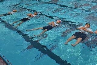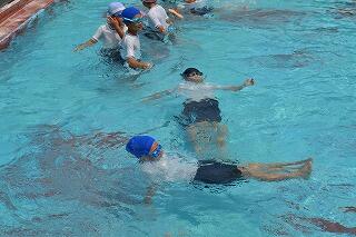 小学部では、体育の時間に着衣泳を行いました。体育着を着て泳ぐといつも以上に重くなり、泳ぎにくいことが分かったようです。ペットボトルや買い物袋の利用についても考えました。
