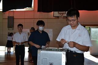 | 中身が空なのを確認します | 実際の記載台で記入中 | 中学校最後の投票をする3年生 |