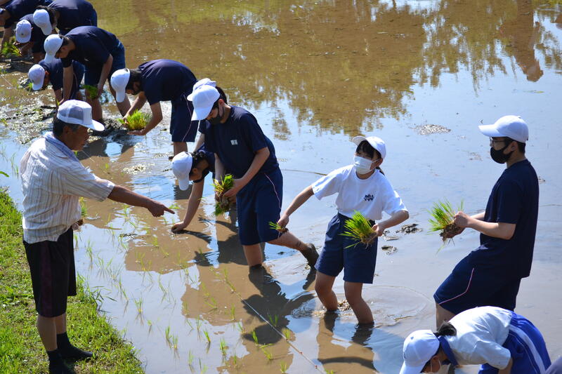 本年も妙地区の田をお借りして全校で田植えを行いました。地域の方々にも協力いただき、スムーズに植えることができました。台風や鳥獣被害に遭わないように案山子を立てたり、草取りなどをしたりして見守っていきたいと思います。秋にはたくさんのもち米が収穫できることを楽しみにしています。
