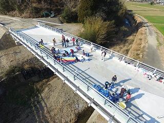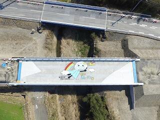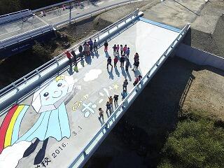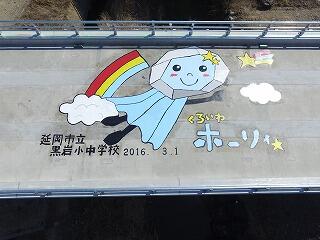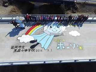 大雨による冠水にたびたび見舞われていた鹿狩瀬橋の立て替え工事が現在行われています。小学部の児童全員で地域の安全を願って橋の路面に学校キャラクター「くろいわホーリィ」を描きました。