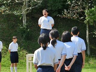 校内文化祭(くろいわ祭)に向けて、生徒会が企画した「大きな声コンテスト」がありました。中学部は、文化祭で劇・歌の発表があります。本番1週間前に大きな声を出す練習をグラインドで行いました。先生方が審査員になって一番声の出ている人を審査しました。優勝者は2年男子でした。