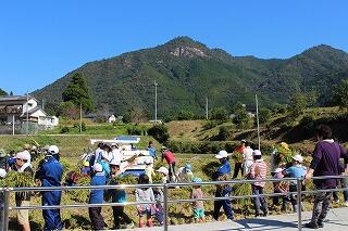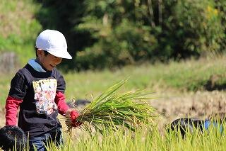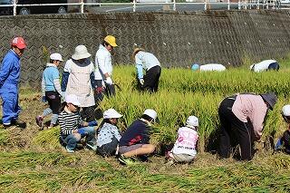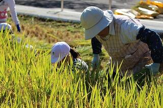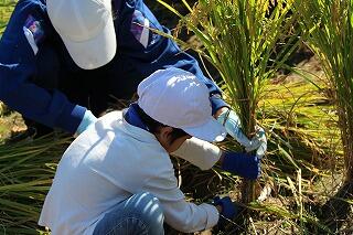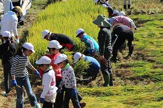 ●地域の方々の指導で小学生が鎌で稲を刈っています。