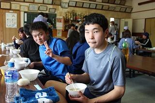 ぞくぞく到着して、完歩賞をもらっています。その後がお楽しみの「豚汁」「ぜんざい」です。とてもおいしく何杯もおかわりしている人もいました。地域と子どもたちの交流が図られたよい歩こう会でした。
