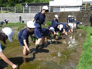 6月14日(金)天気にも恵まれ、「ふれあい田植え」体験を行う事ができました。地域の方にも協力してもらい、全校生徒楽しく、手際よく苗を植えることができました。予想されていたこととは言え、小学生の中には泥だらけになってその後の授業が大変だった児童もいたようです。
