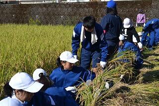 6月に田植えをして4か月。小中学生は毎年実施しているので、大きく成長した稲を慣れた手つきで刈り取っていきました。2時間ほどの活動でしたがとても貴重な体験となりました。