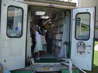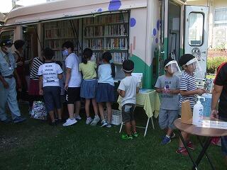 子どもたちは、ふくろう号が来るのを首を長くして待っていたようで、昼休みになるとふくろう号めがけて駆け出す子どもたちがたくさんいました。小学部の子どもたちは、全員が本を借りに来たようでした。中学部の生徒も来て、7冊も借りた生徒もいました。