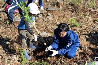 急斜面でしたが、小学生と中学生が協力して植樹しました。植えた木は、サトザクラ、イチイガシ、モミジ、クヌギ、ケヤキです。