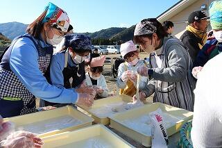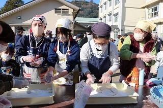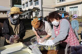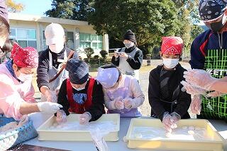 12月15日(日)は、天候にも恵まれ予定通り(手際が良く計画より少し早く終わりましたが)自分達の刈り取ったもち米を使って、地域の方々にも協力を得ながら餅つき→餅丸め→袋詰め→試食を行いました。地域の方にお礼の言葉と袋詰めした餅をプレゼントしました。また中学3年生に受験を頑張るようにエールを送りました。午後はPTAバザーが行われ、お手伝いや飲食を楽しんでいました。