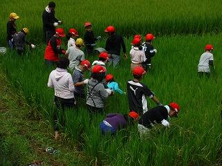 小学生は、6月に田植えをした田んぼ、中学生は各地区にある花壇の草取りを行いました。暑い中でしたがみんな頑張っていました。