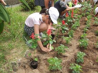 中学部は、校内の花壇と各地区にある花壇に花の苗を植えました。