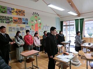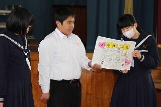 赤い羽共同募金で集めた小学部・中学部の募金を延岡市社会福祉協議会の方に手渡しました。手渡したのは、中学部生徒会長・副会長、小学部児童会の代表です。