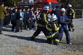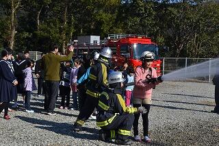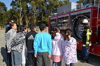 火災発生を想定した避難訓練を小学部・中学部で実施しました。避難訓練の後には、放水訓練の体験や消防車の説明等をしていただきました。