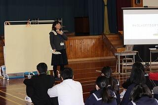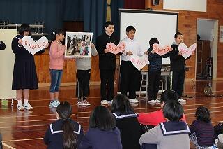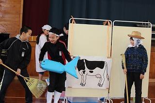 栄養教諭の先生・調理員さん・パンをつくっていただく方、牛乳をもって来ていただく方、給食を小学校から配送していただく方等への感謝の気持ちを発表する会を開きました。初めに、栄養教諭の先生から給食をつくるときの工夫・苦労等について話していただいました。その後、中学部の生活委員会、小学部の元気っ子委員会が給食に関係する話を劇にするなどして発表しました。