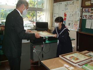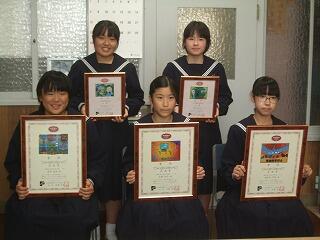 表彰されたのは、金賞(海老原実結さん,末廣詩子さん)、会長賞(直野琉南さん)、入選(西田瑞希さん、上原明莉さん)の5人です。他の生徒の皆さんも、どれも甲乙つけがたい力作ぞろいでした。まさに、「芸術にも特化した黒岩中学校」です。