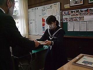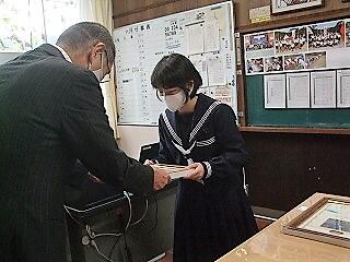 「受信環境クリーン図案コンクール」で、すばらしい作品を作った生徒の表彰がありました。表彰は、校長室であり、総務省九州総合通信局の課長さんがわざわざ熊本から来て行われました。