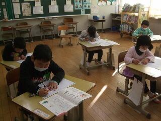 低学年は鉛筆で、3年生以上は毛筆で行いました。3年生以上は、自分で考えたり、選んだりした四字熟語などを書きました。子どもたちそれぞれに、味のある字を書いていて、一人一人の思いがこもった作品ができていました。