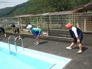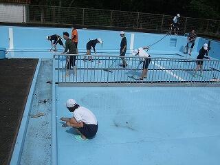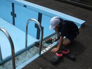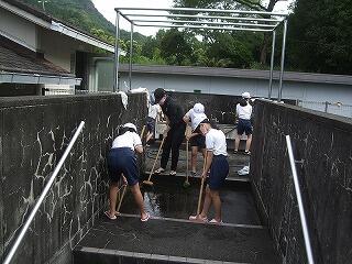 今月下旬から、水泳の学習が始まります。それに備えて、プールの掃除をしました。2年ぶりのプールは、汚れがひどく大変でしたが、小学生・中学生みんなで力を合わせてきれいにしました。水泳学習が楽しみです。