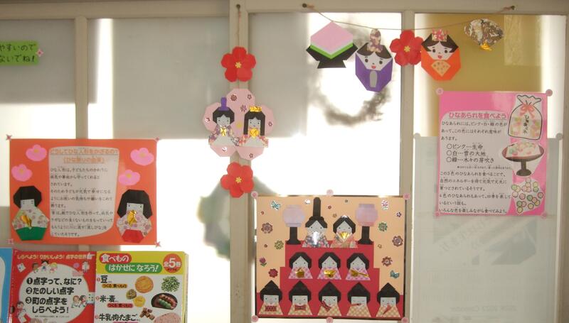 廊下の掲示板の様子です。季節を感じさせる掲示物です。ちなみに、3月3日は「耳の日」でもあります。