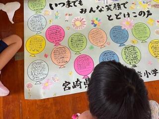 子どもたち一人一人が風船型の紙に書いたメッセージを用意しておき、それを一枚の模造紙に貼って完成させるために集会を開いたのですが、仕上げるために熱心に取り組む姿が見られ、感心させられました。