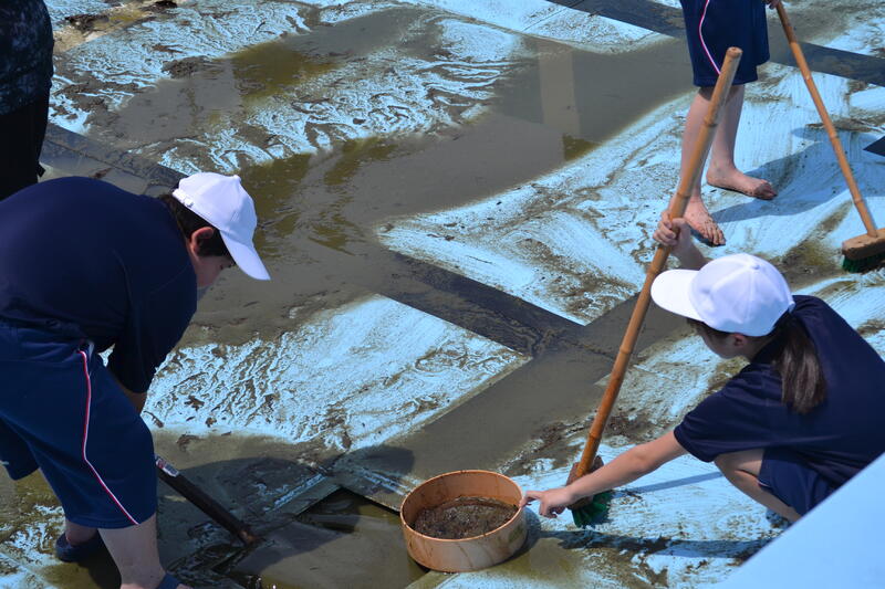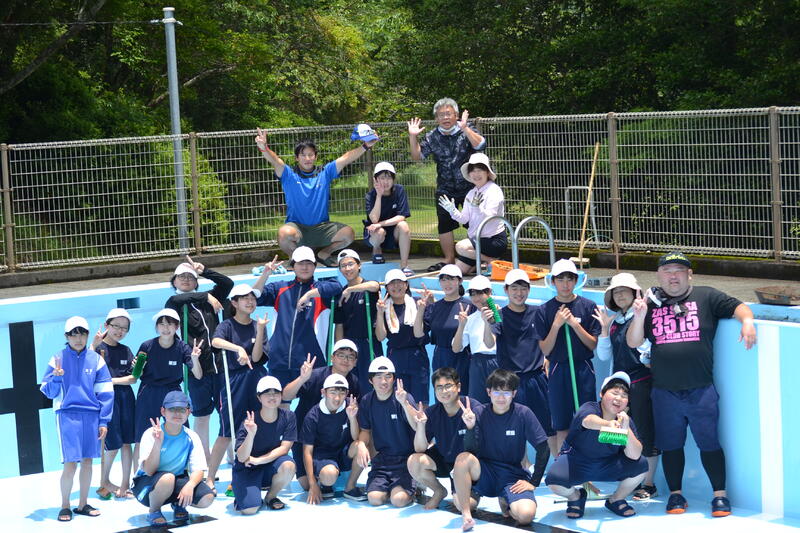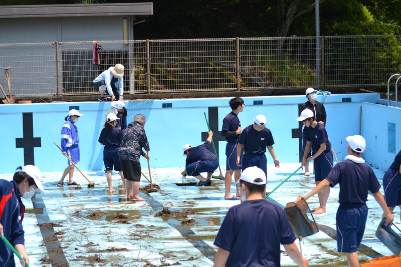 小学部は22日(木)に、中学部は27日(火)にプール開きがあります。それに向けてプール清掃を行いました。1年間の泥や落葉がたくさん積もっていて、それを外に運び出し、中の床や壁、プールサイドをきれいに磨きました。とてもきれいになったプールで、これから気持ちよく水泳学習ができます。