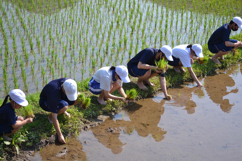 本年も妙地区の田をお借りして全校で田植えを行いました。地域の方々にも協力いただき、スムーズに植えることができました。台風や鳥獣被害に遭わないように案山子を立てたり、草取りなどをしたりして見守っていきたいと思います。秋にはたくさんのもち米が収穫できることを楽しみにしています。
