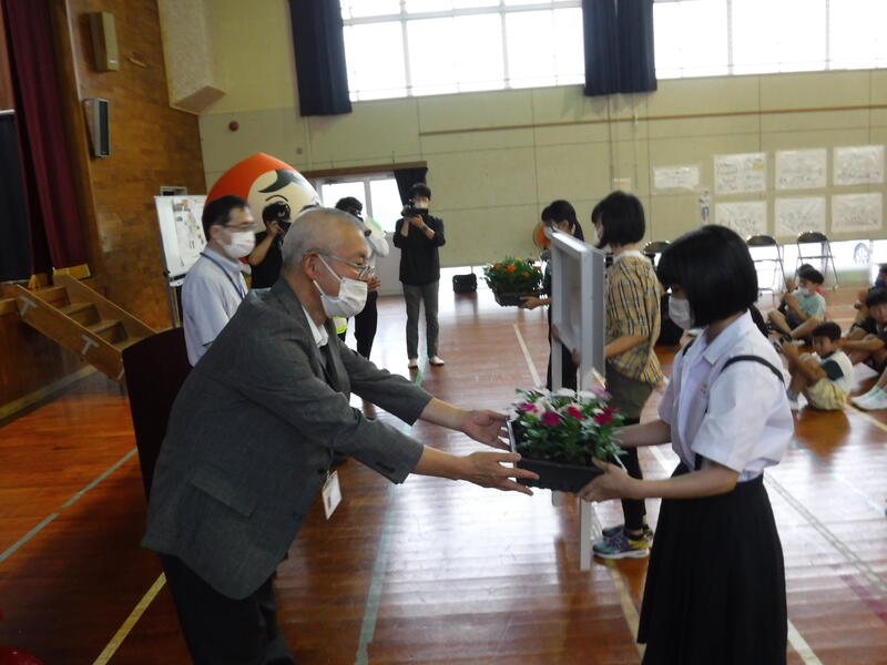 人権啓発活動地域活性化事業の一環として、子どもたちが互いに協力しながら花を栽培することによって、命の大切さや思いやりなどを育てていく「人権の花」贈呈式がありました。いただいた花を学校の花壇や6地区の集会所に植えていきます。学校や地域を花でいっぱいにして、明るい黒岩地区にしていきたいと思います。また、贈呈式には、「人権まもるくん」と「人権あゆみちゃん」も来てくれて、子どもたちはとても喜んでいました。